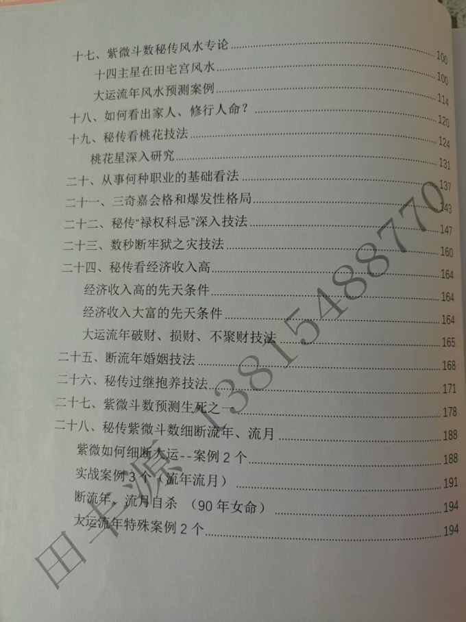 紫微斗数密传弟子班课程简介 皇家千古秘传帝王之术 皇家秘传紫微斗数四大亮点: 第一、理论体系完整,理论与实战完美结合,招招实用,句句精典,照书就可直断。无基础者参加实战班两个月学习就能独立预测。精研半年后成同行业骄骄者。少走5-10年弯路。 第二、断命技法是其核心精髓,掌握技法就能数秒铁口直断,比铁板神数还要快。稳、准、快是其断命特点,排出命盘就可直断,可秒杀对方。如“禄权相会必是老板命”,“某宫化忌迁移冲命无缘份”,“无底洞心法秘断”等几十种速断技法,让你出口不凡、语惊四座。 第三、首次公开原命、大限、流年天、地、人三盘应用技巧,断大限流年、看前因后果,易如翻掌。 第四、独家秘传宫位、星相、四化小天、地、人三盘绝技,断命断事更精细入微、可出神入化、步入神数境界,是千万紫微斗数爱好者梦寐以求的宿愿,让你如愿以偿。 学习费用:微信咨询。 课程设置: 一、天、地、人三盘实战训练 1、断身高、长相、气质训练。 2、宫位、星象、四化断婚姻训练。 3、宫位、星象、四化断事业训练。 4、宫位、星象、四化断财运训练。 5、宫位、星象、四化断子女训练 6、宫位、星象、四化断病灾训练。 7、宫位、星象、四化断风水训练。 通过大量实战案例集训,迅速提高学员精准断命水平。 二、紫微斗数高级理论实战技法 1、双星碰对技法 2、宫星同气技法 3、无底洞心法绝技 4、宫位强弱吉凶原则 5、禄存星细讲实战技法 6、禄随忌转,我宫他宫技法 7、紫微秘传二宫归一技法 8、禄、权、科、忌深入应用技法 9、紫微斗数十四主星秘传技法 10、紫微斗数十二宫四化到十二宫位详解。 三、紫微斗数秘传高级实战技法 1、紫微斗数如何看面相技法。 2、紫微如何看癍痕、黑痣技法。 3、紫微断进财、破财、聚财技法。 4、紫微如何断互欠经济债务技法 5、紫微如何看企业破产倒闭技法。 6、宫位、星相、卦位断疾病技法。 7、六吉星、六煞星断风水详解。 8、十四主星断家宅风水详解。 9、紫微斗数如何看鬼神秘断。 10、心法起盘断对方生肖秘法 11、紫微斗数断楼层数字等秘法。 12、精准断大运、流年、流月技巧。 13、精准断大运、流年实战案例详解。 14、详解紫微斗数流日、流时技法。 15、紫微斗数择吉日秘法 16、来人不开口就知心中事秘法。 17、如何看养情人、偷情、嫖娼技法。 18、如何断公司大小、跨国公司技法 19、数秒精断牢狱之灾技法 20、紫微斗数断过继抱养技法 21、紫微斗数断生死寿命技法。 22、如何速断残疾人技法。 23、二宫归一技法的实战应用。 24、如何断判大富贵、鲤鱼跳龙门格局。 25、紫微实战绝技速断24条法诀。 更多技法内容,课堂中详解。 学会此课程,可迈入天下第一神数的境界,也是千万紫微斗数爱好者梦寐以求追寻的宿愿。使你如愿以偿。 有想进一步深入学习的可私聊。弟子班课程尚未开课。 注:如需面授,面授速成班2-3天,实战训练课发教材自学。 秘传弟子班又为终生弟子班,一次性交费,终生学习。 ![]() ![]() 部份目录 ![]() ![]() ![]() 中华国学紫微斗数专业教学网 http:www.zwdhu.com 田丰源 13815488770(微信同号) 2022年12月1日 |